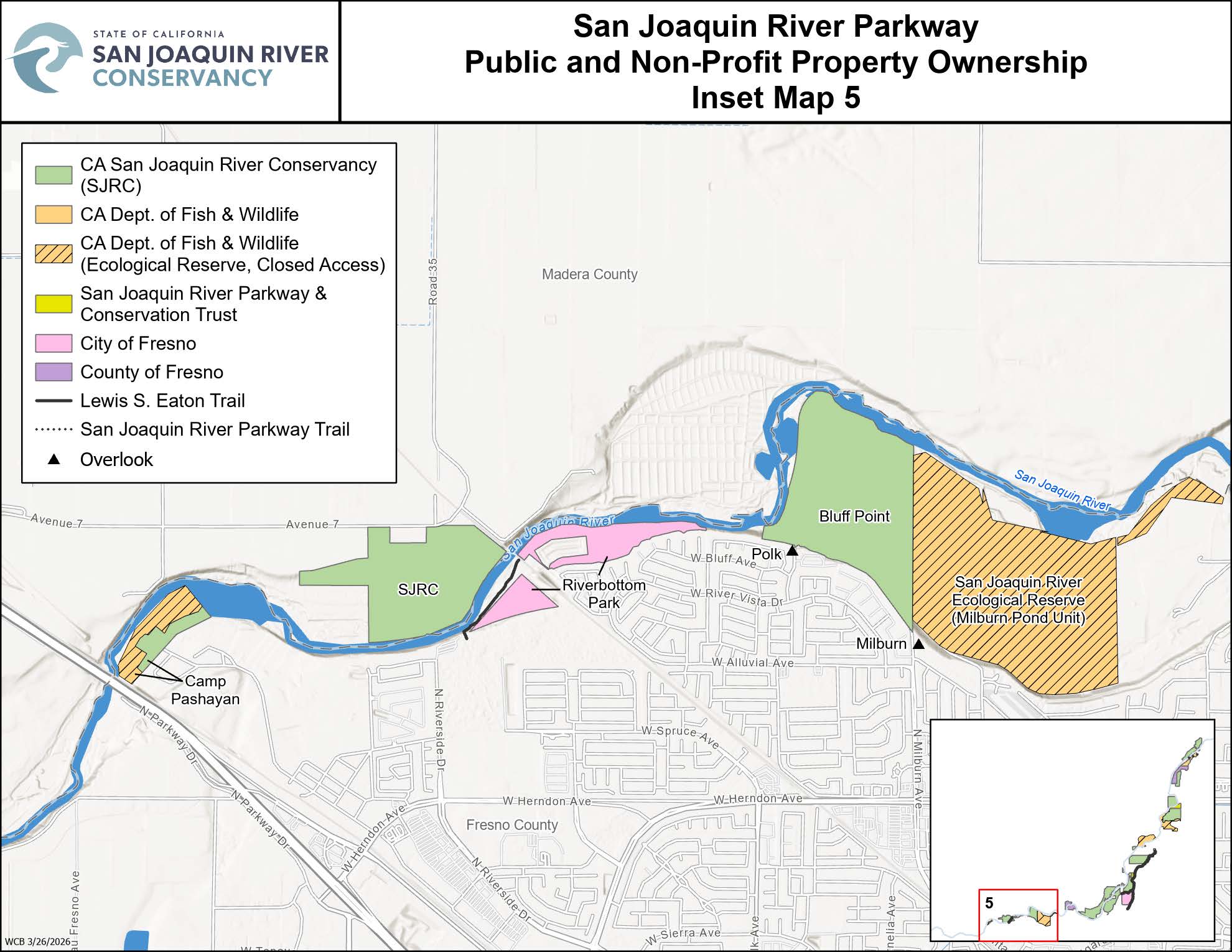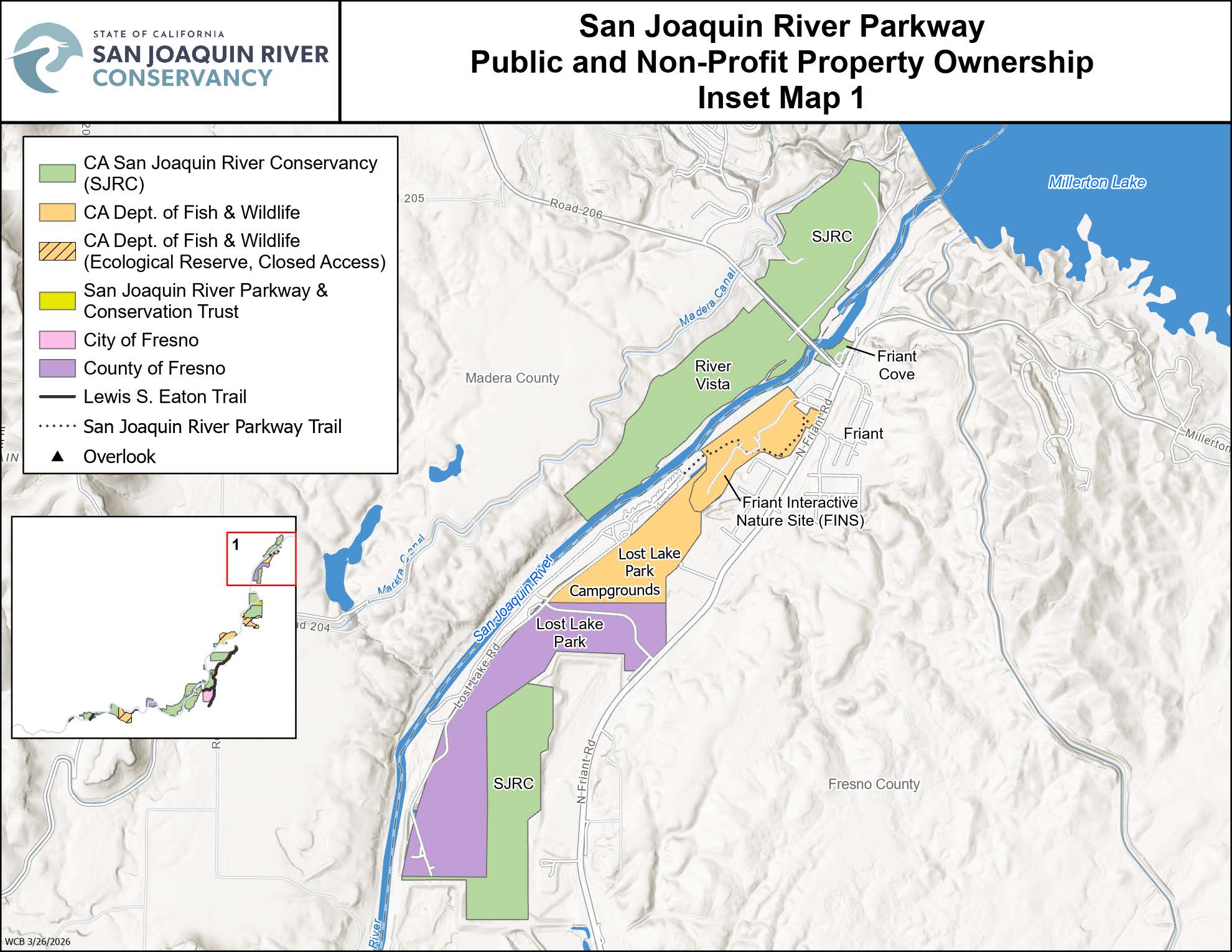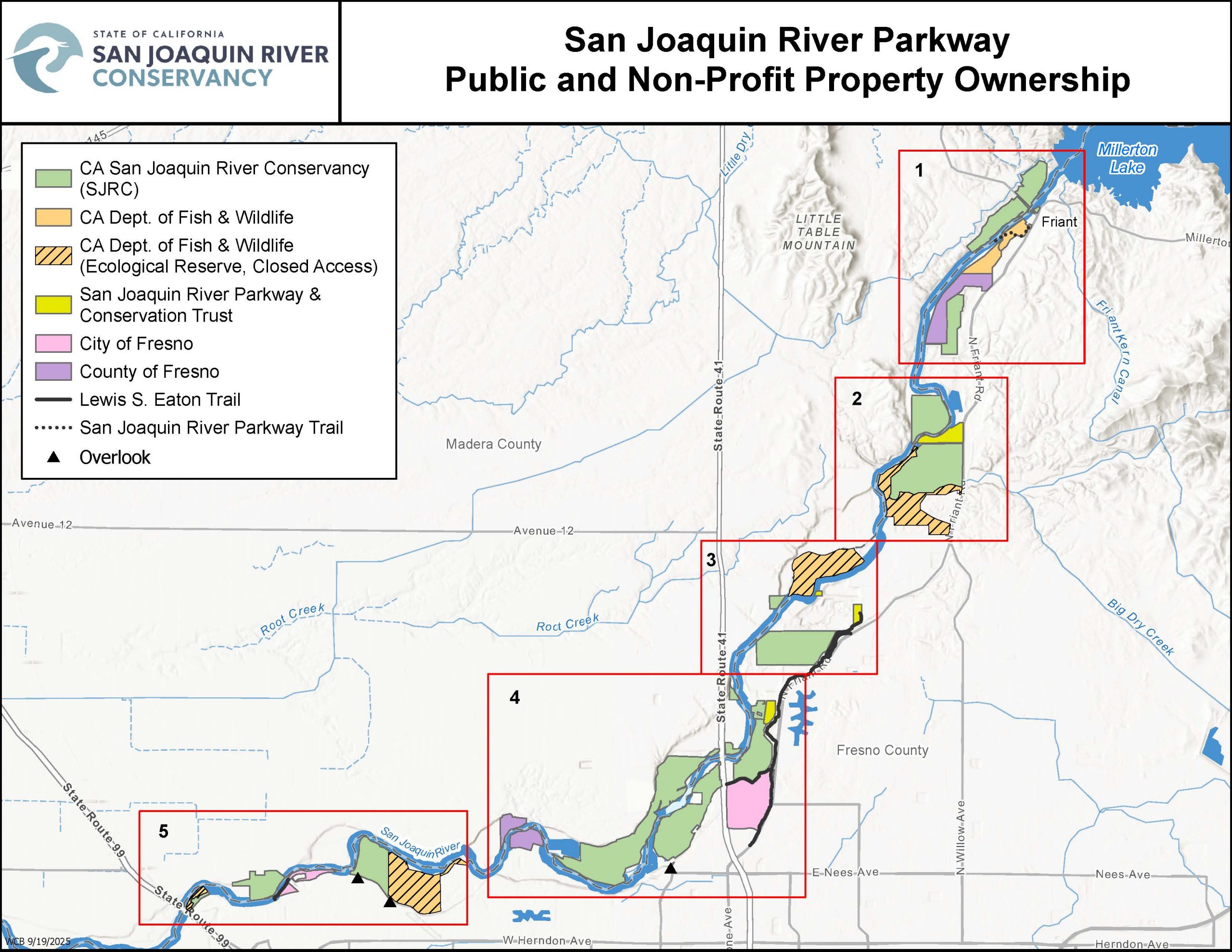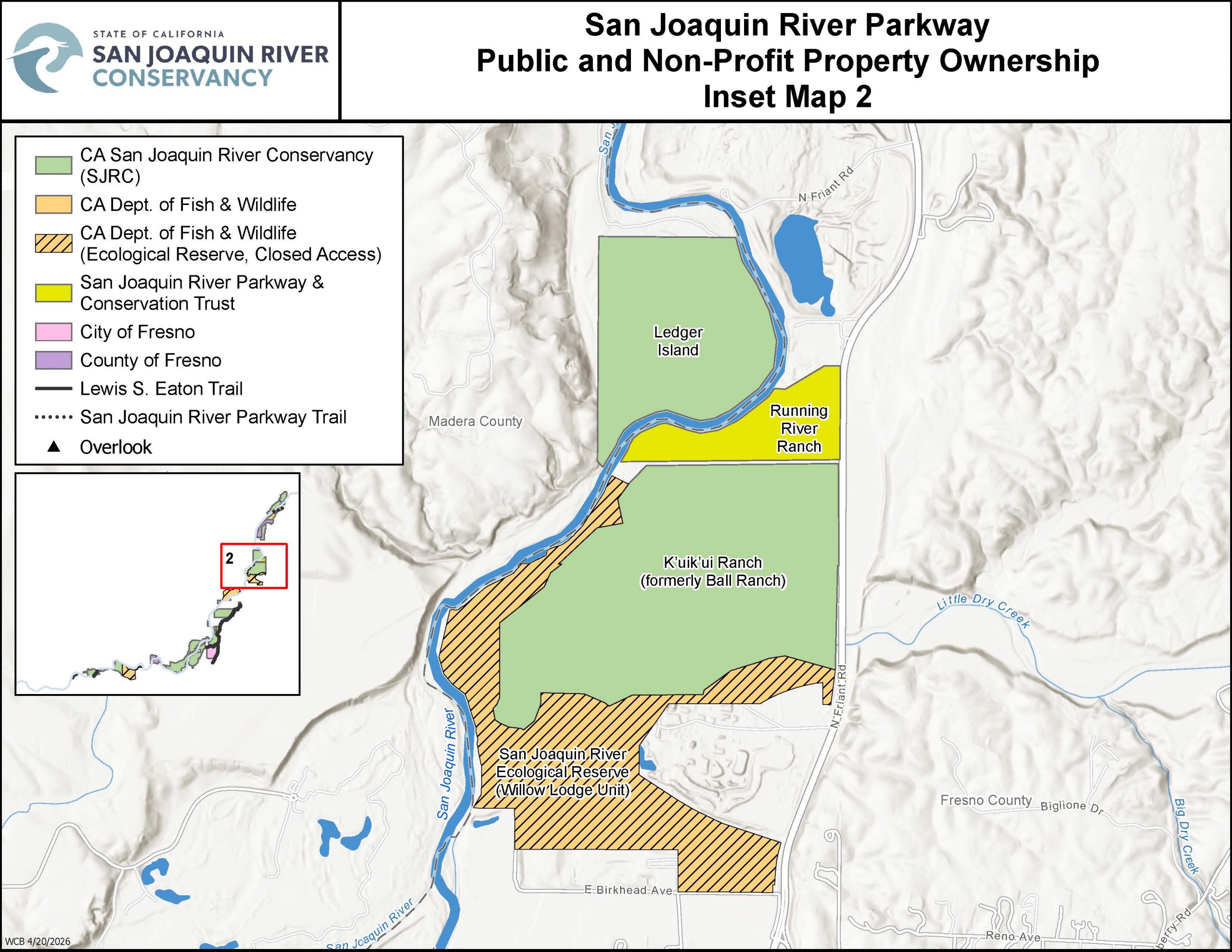 Map of San Joaquin River Parkway depicting the entirety of the Parkway and insets.