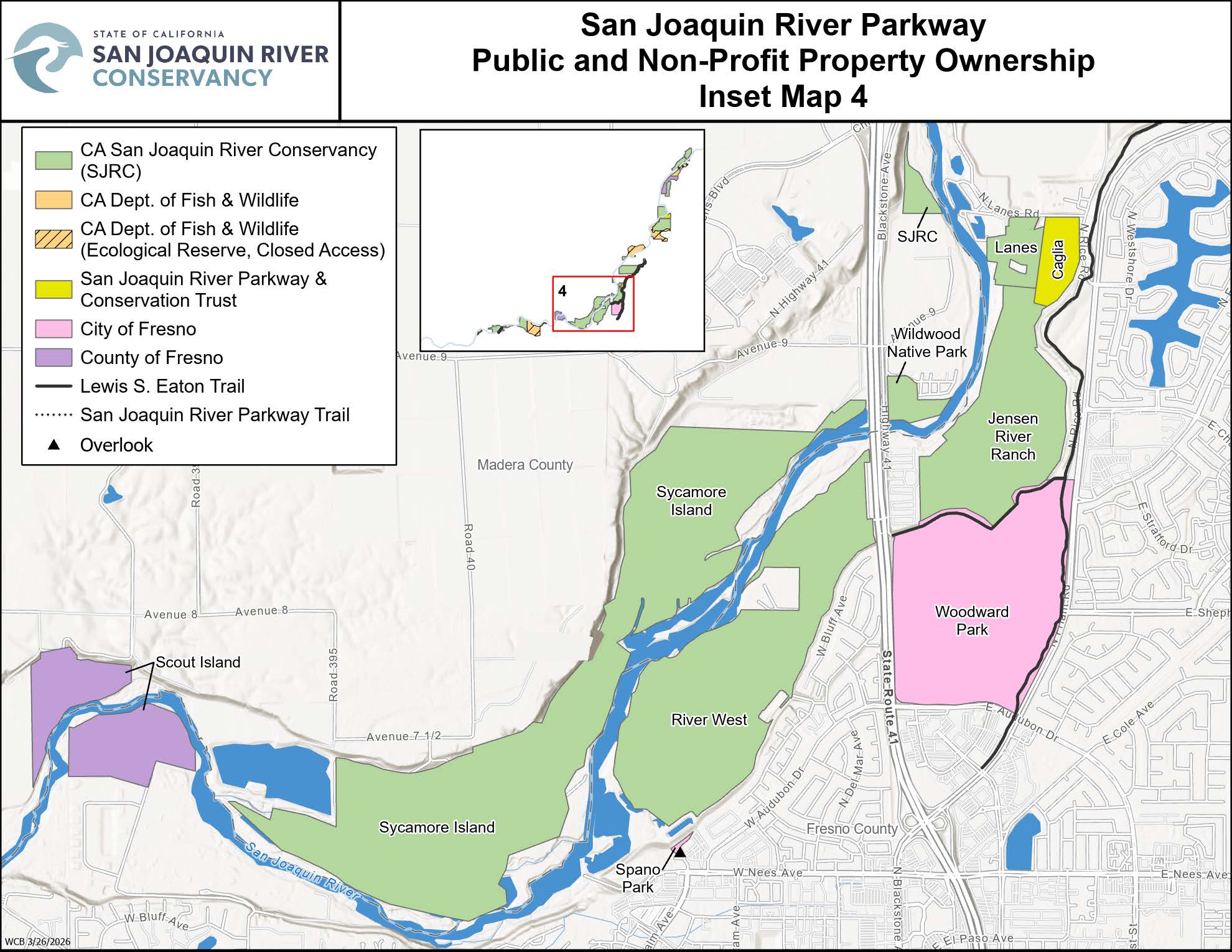 Open properties shown on map inset 1: Jensen River Ranch, Woodward Park, Sycamore Island, Scout Island